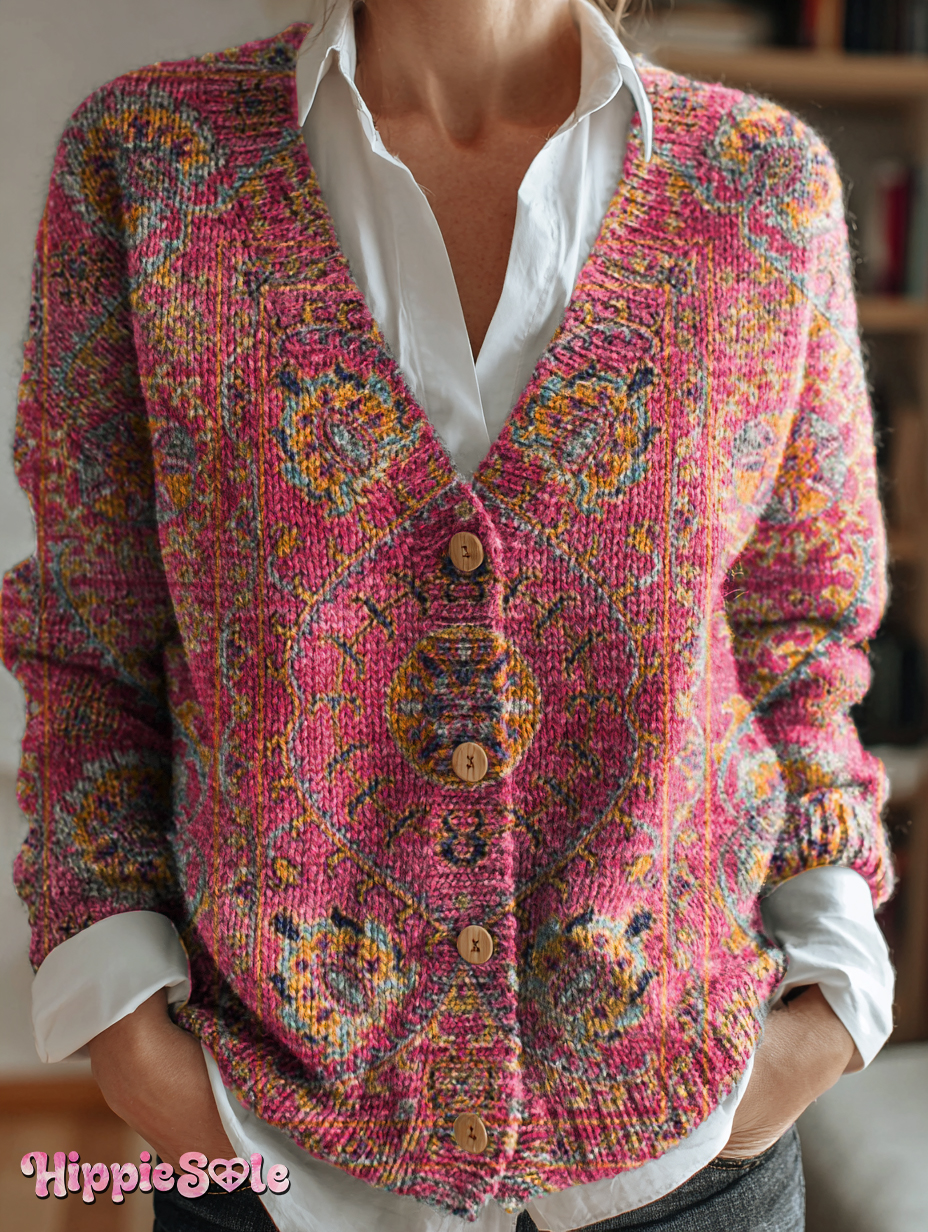 Colorful Retro Totem Art Print Buttoned V-neck Cardigan Sweater