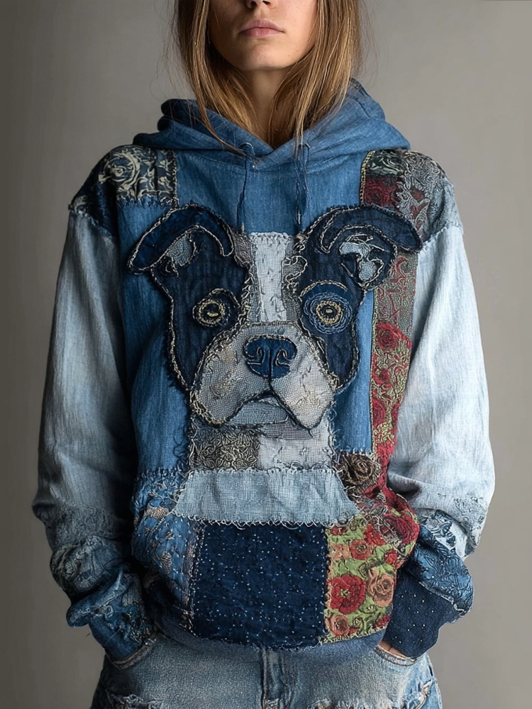 Cute Dog Boho Floral Embroidered Patchwork Cozy Hoodie