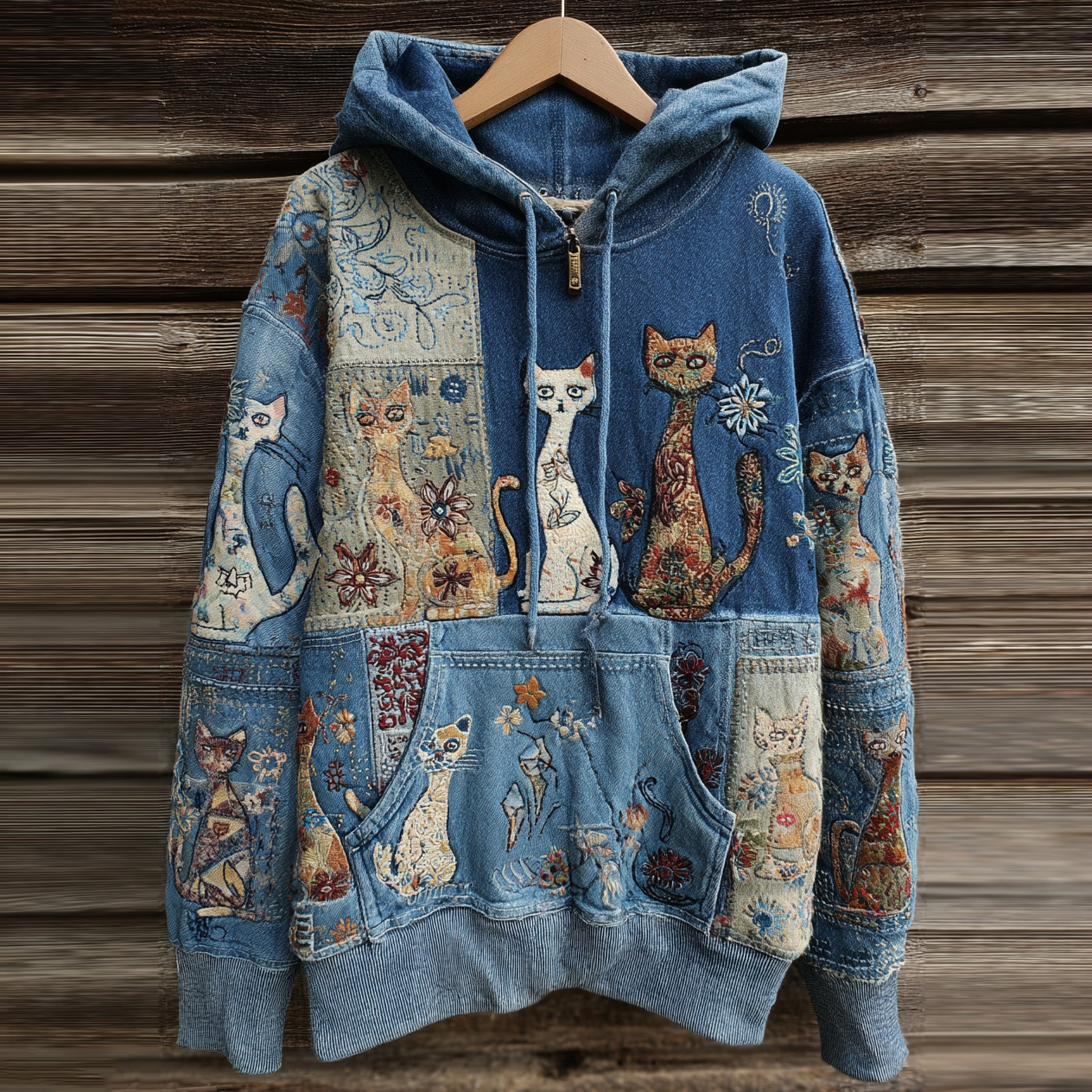 Denim Patchwork Cute Cat Bohemian Floral Print Hoodie