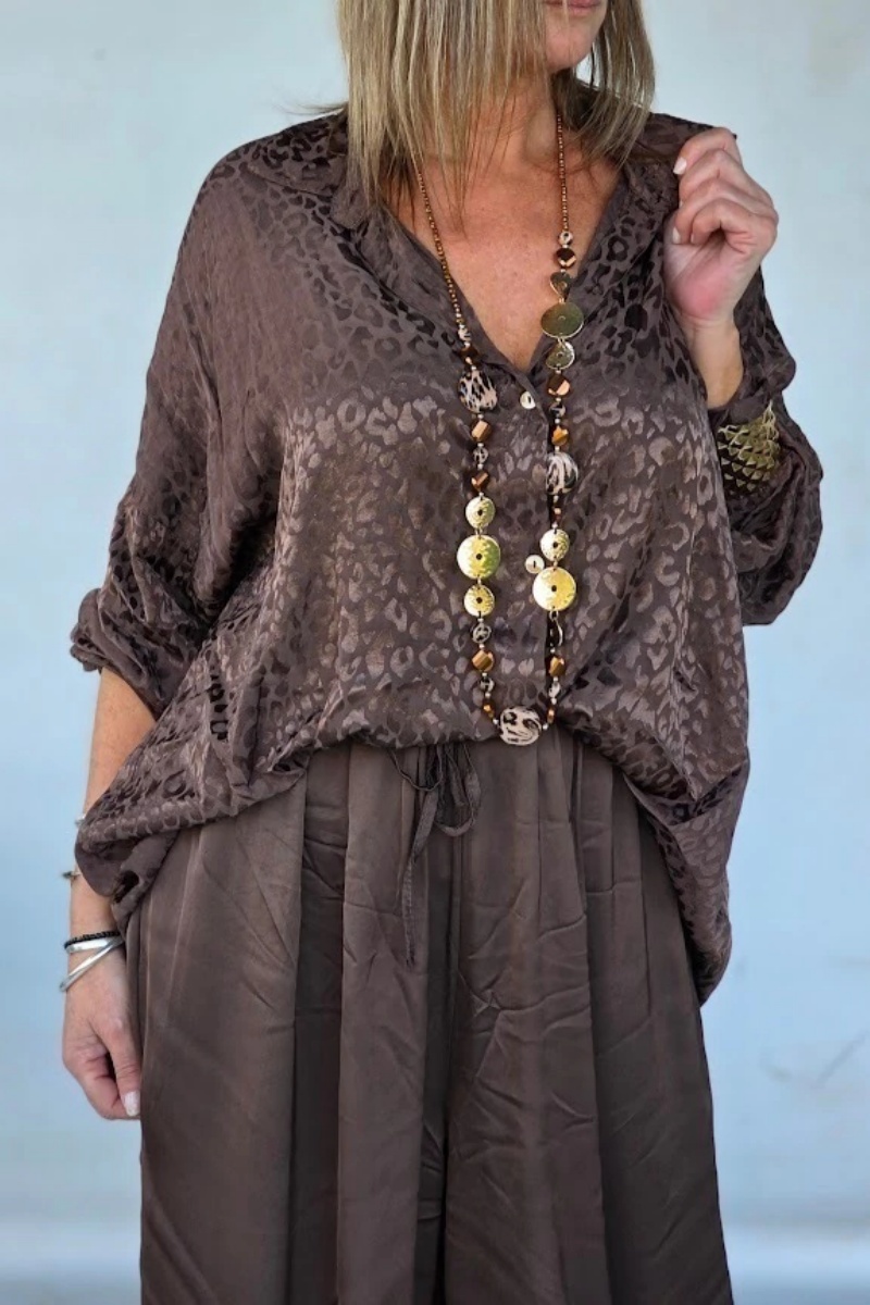 Leopard Print Silk Shirt+Brown Silk Pants