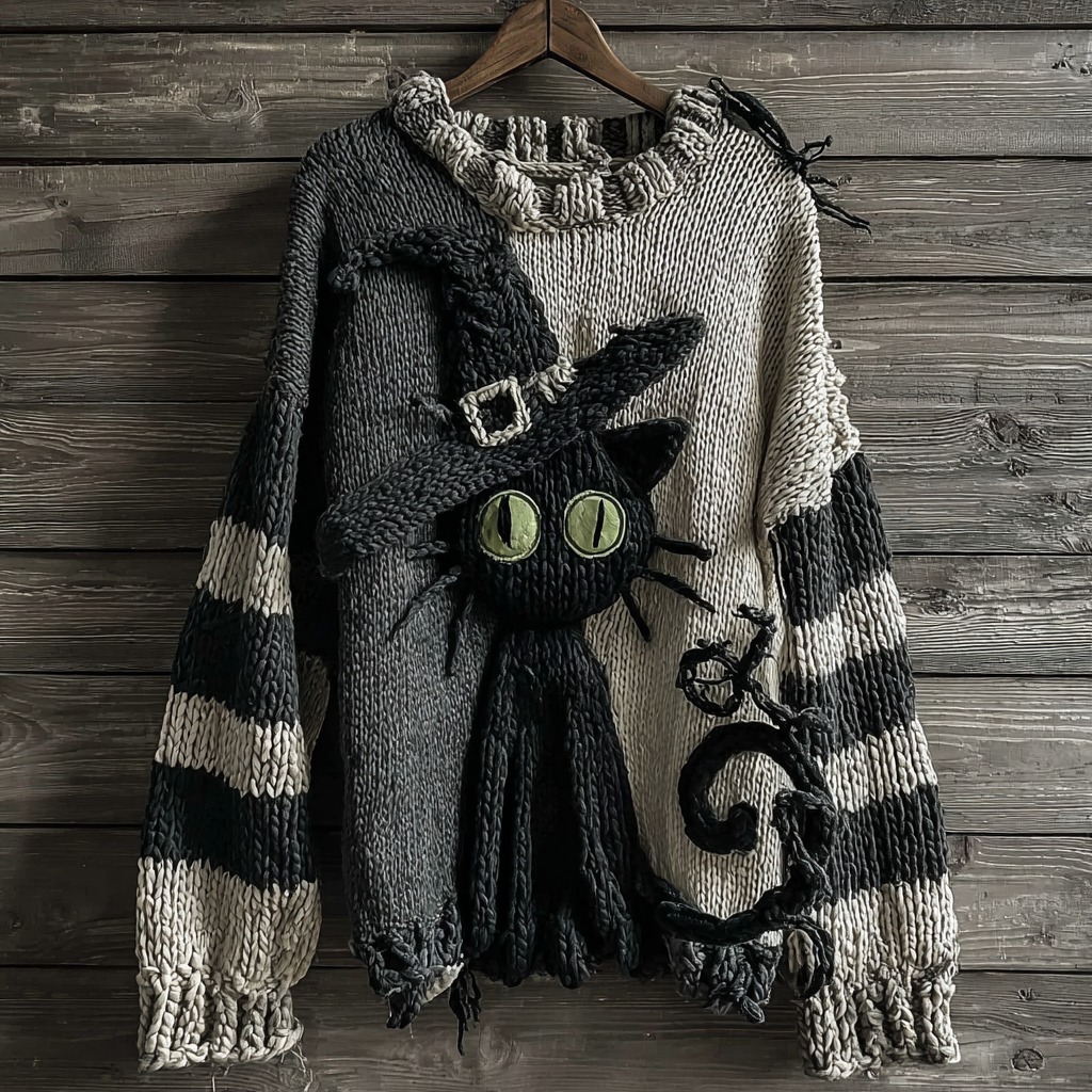Halloween Black Cat Striped Knitted Warm Crew Neck Sweater