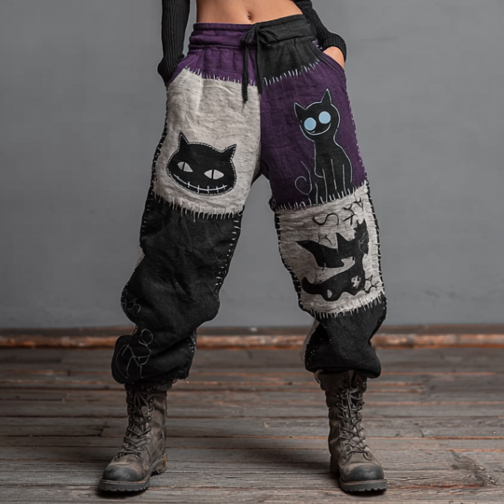 Halloween Patchwork Funny Cat Vintage Sports Pants