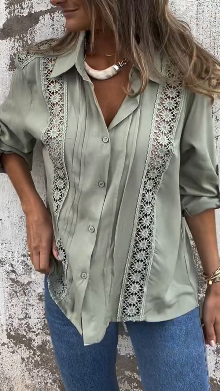 Ladies Lapel Patchwork Printed Hollowed Out Casual Top
