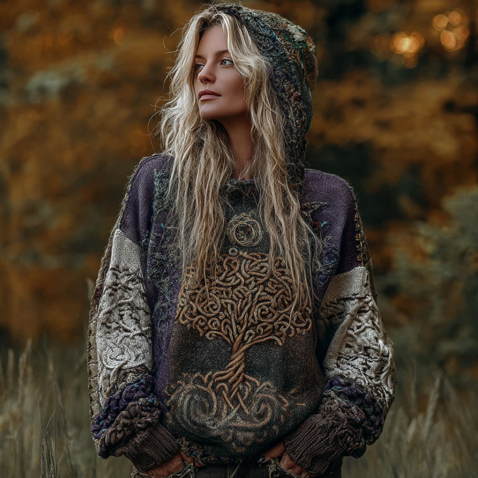 Viking Retro Life Tree Lady Hooded Thick Sweater