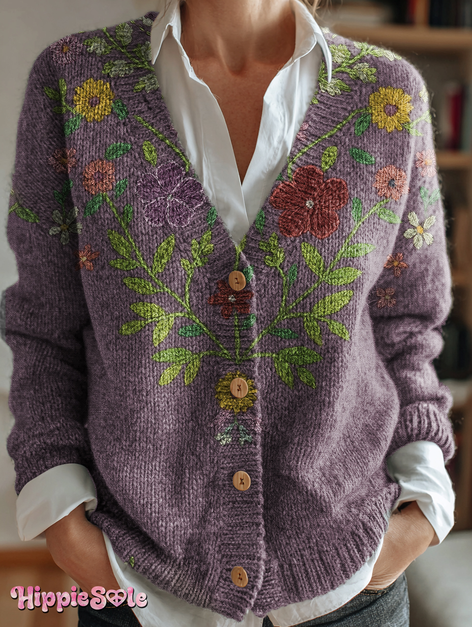 Vintage Ethnic Floral Art Print Buttoned V-neck Cardigan Sweater