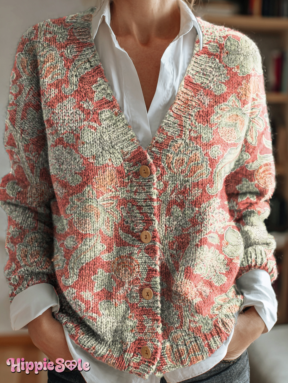 Vintage Floral Art Print Buttoned V-neck Cardigan Sweater