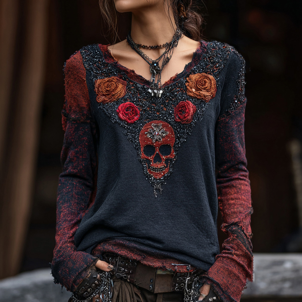 Vintage Rose Skull Hot Diamond Contrast Color V-neck T-shirt