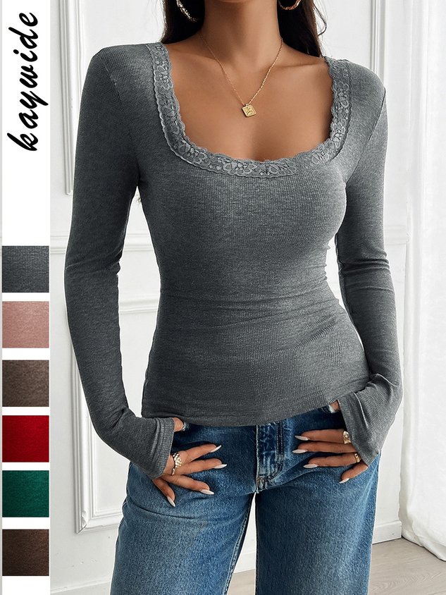 Women Floral Long Sleeve Tee T-shirt Square Neck Split Joint Casual Spring/Fall Top