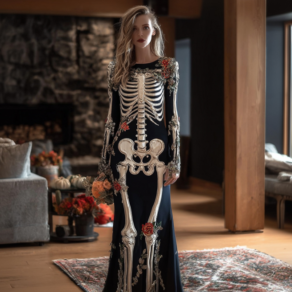 Women Halloween Human Anatomy Art Gothic Black Long Dress