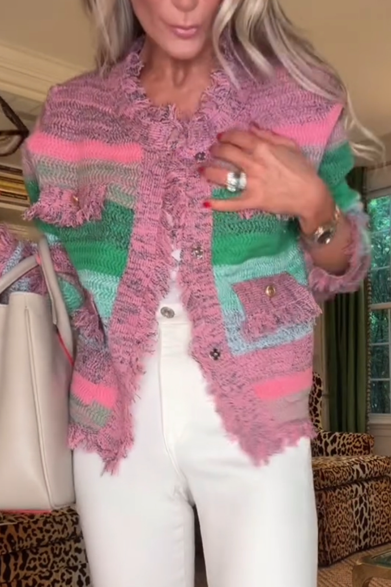 Women Round Neck Multi-color Knitted Casual Cardigan