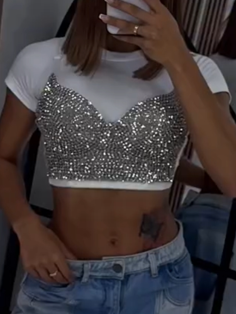 Women Round Neck Splicing and Hot Diamond Casual Vacation Two-piece Top
