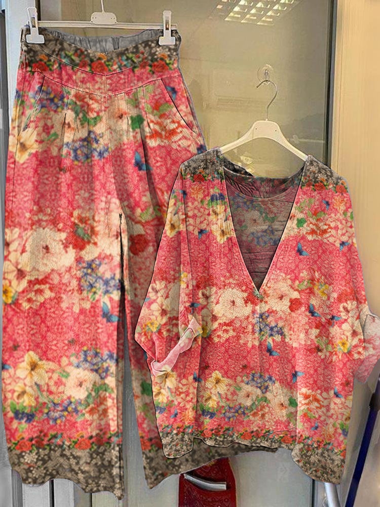 Women's Floral Pattern Art Print V-Neck Top Wide Leg Pants Cotton Set