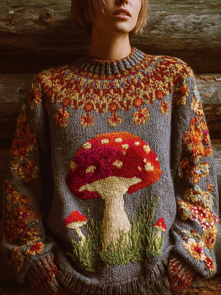 Women's Retro Mushroom Print Crew Neck Sweater