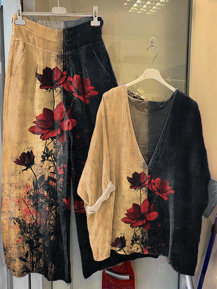 Women's Retro Rose Flower Art Printed V-Neck Top Wide-Leg Pants Cotton Linen Suit