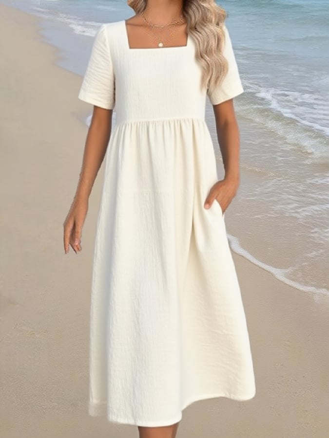 Women'S Solid Color Casual Square Neck Cotton And Linen Dress