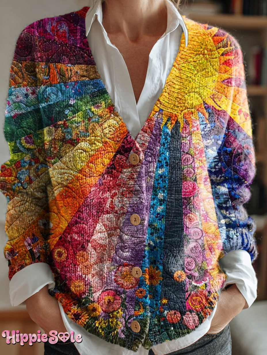 Women's Sun Rainbow Floral Pattern Printed Casual Knitted Long Sleeve Top