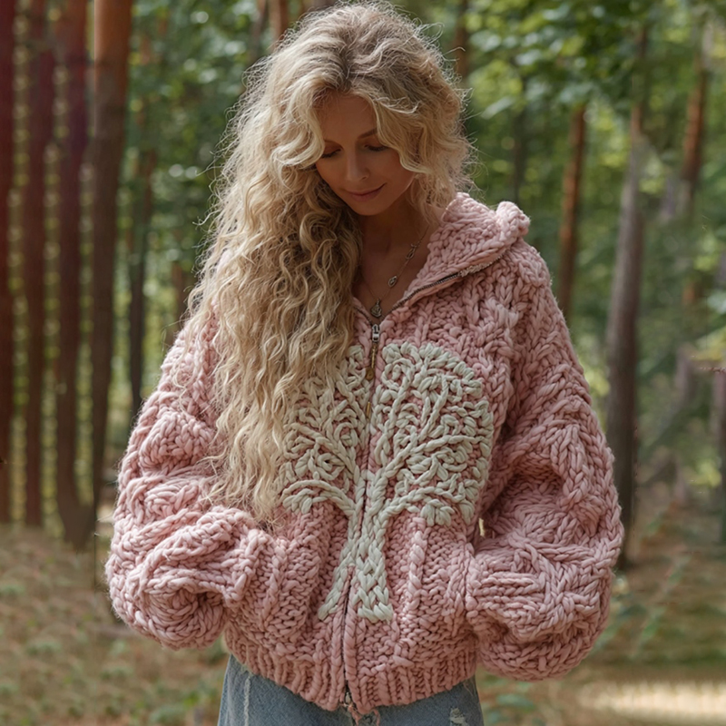 Women's Viking Pink Tree Of Life Art Knit Zipper Cardigan Sweater