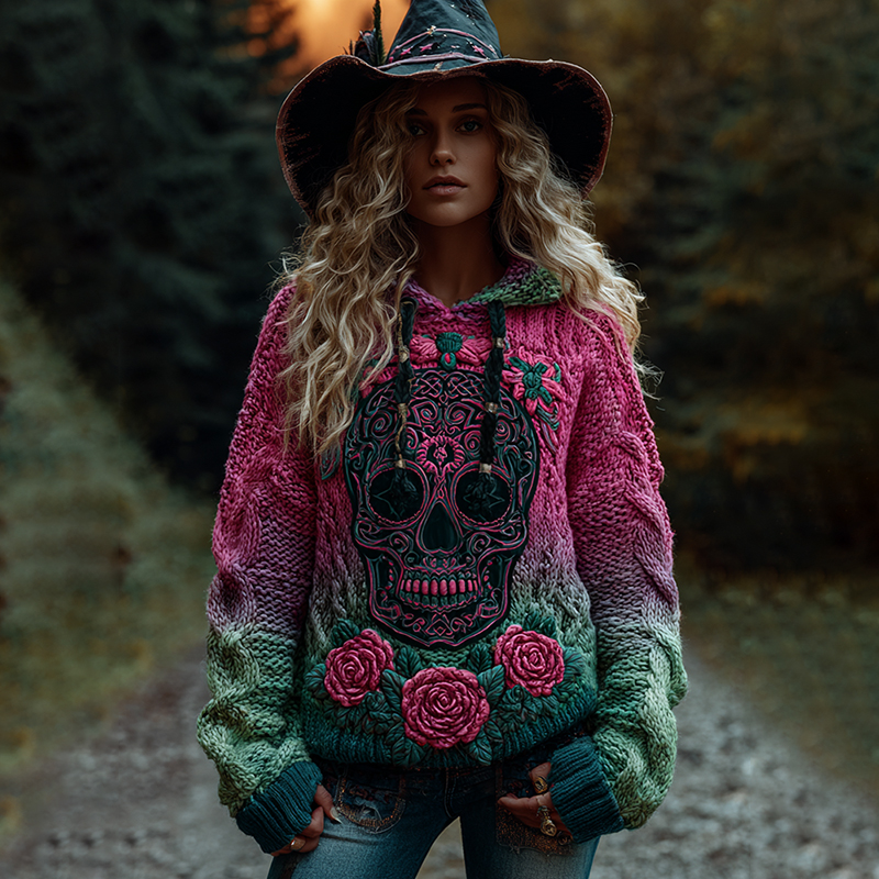Women's Viking Tribal Jacquard Celtic With Rose And Skull Inspired Chunky Knit Hooded Sweater