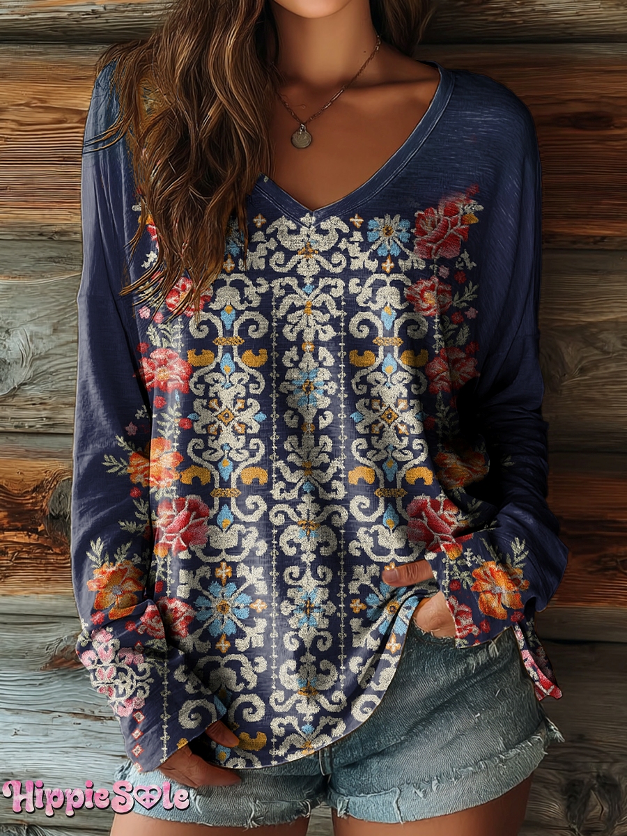 Women's Vintage Ethnic Floral Art Pattern Print Casual V-neck Long Sleeve T-shirt