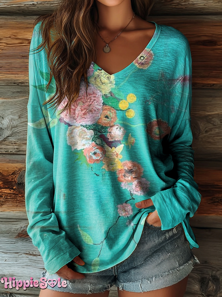 Women's Vintage Ethnic Floral Art Pattern Print Casual V-neck Long Sleeve T-shirt