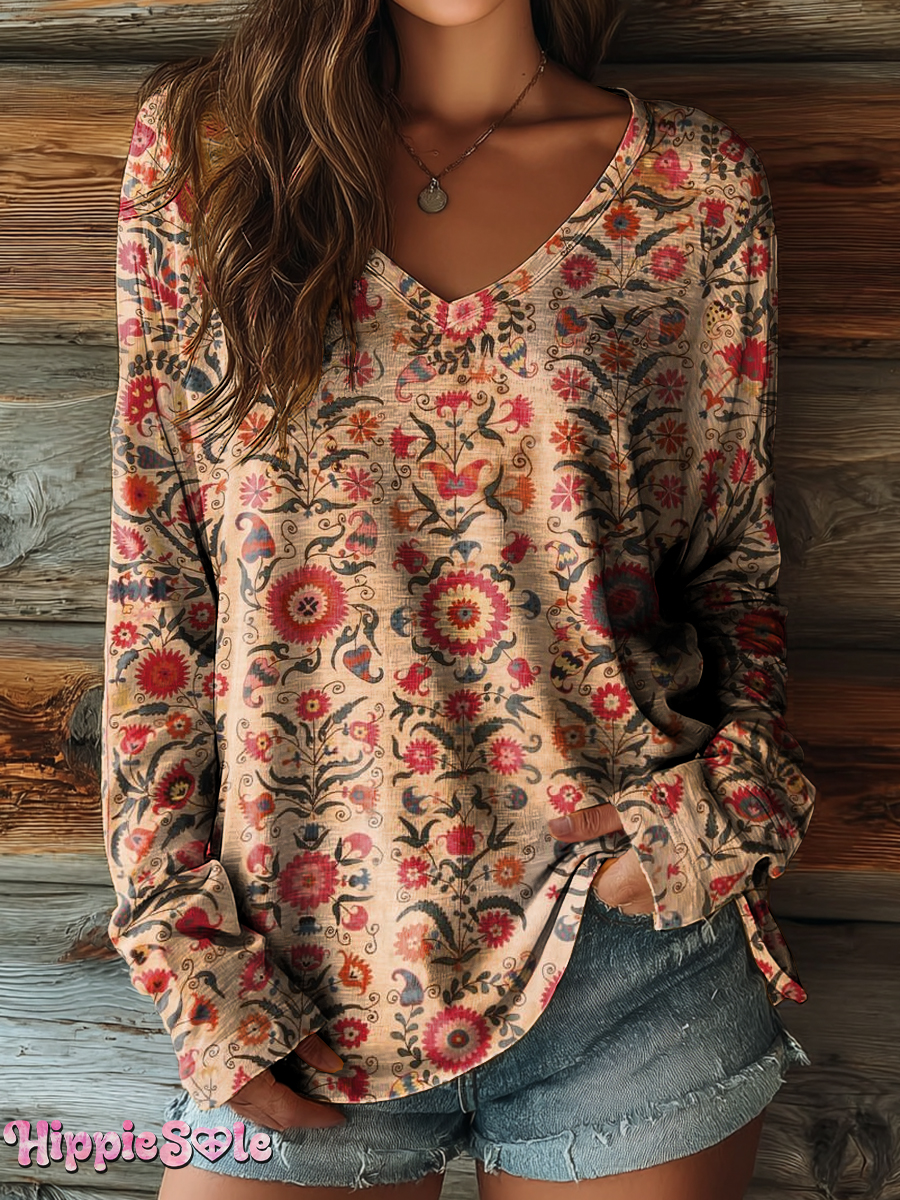 Women's Vintage Ethnic Floral Art Pattern Print Casual V-neck Long Sleeve T-shirt