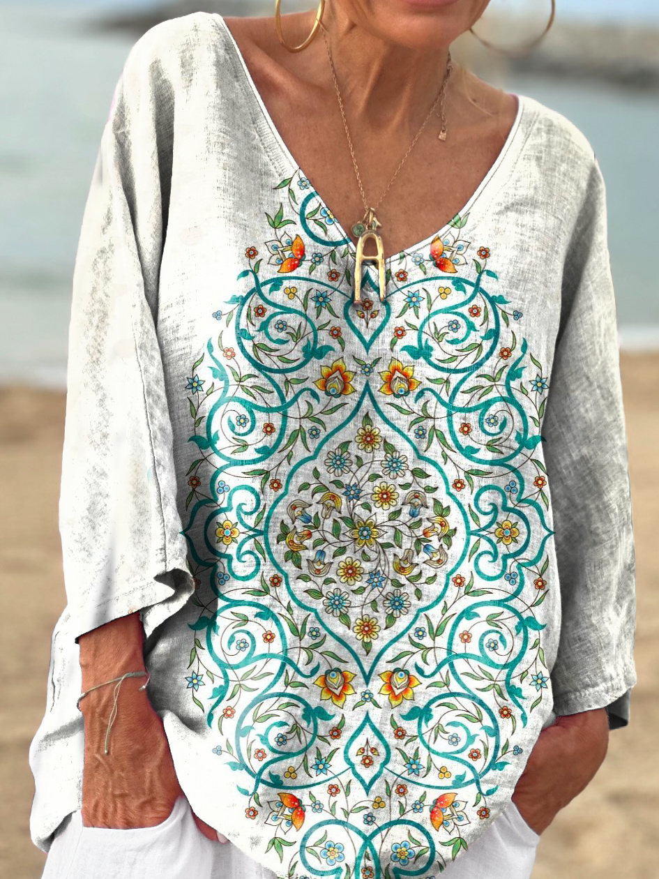 Women's Vintage Ethnic Floral Art Print Casual V-neck Long Sleeve Comfortable Cotton T-shirt