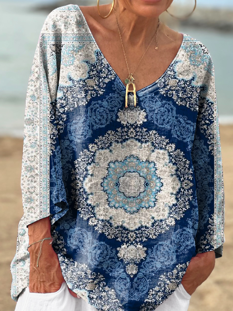 Women's Vintage Ethnic Floral Art Print Casual V-neck Long Sleeve Comfortable Cotton T-shirt