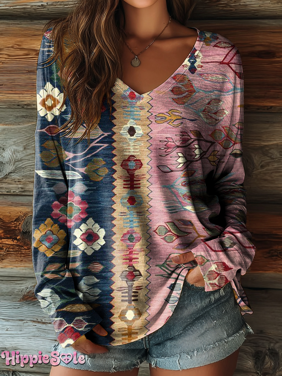 Women's Vintage Ethnic Floral Art Print Casual V-neck Long Sleeve T-shirt