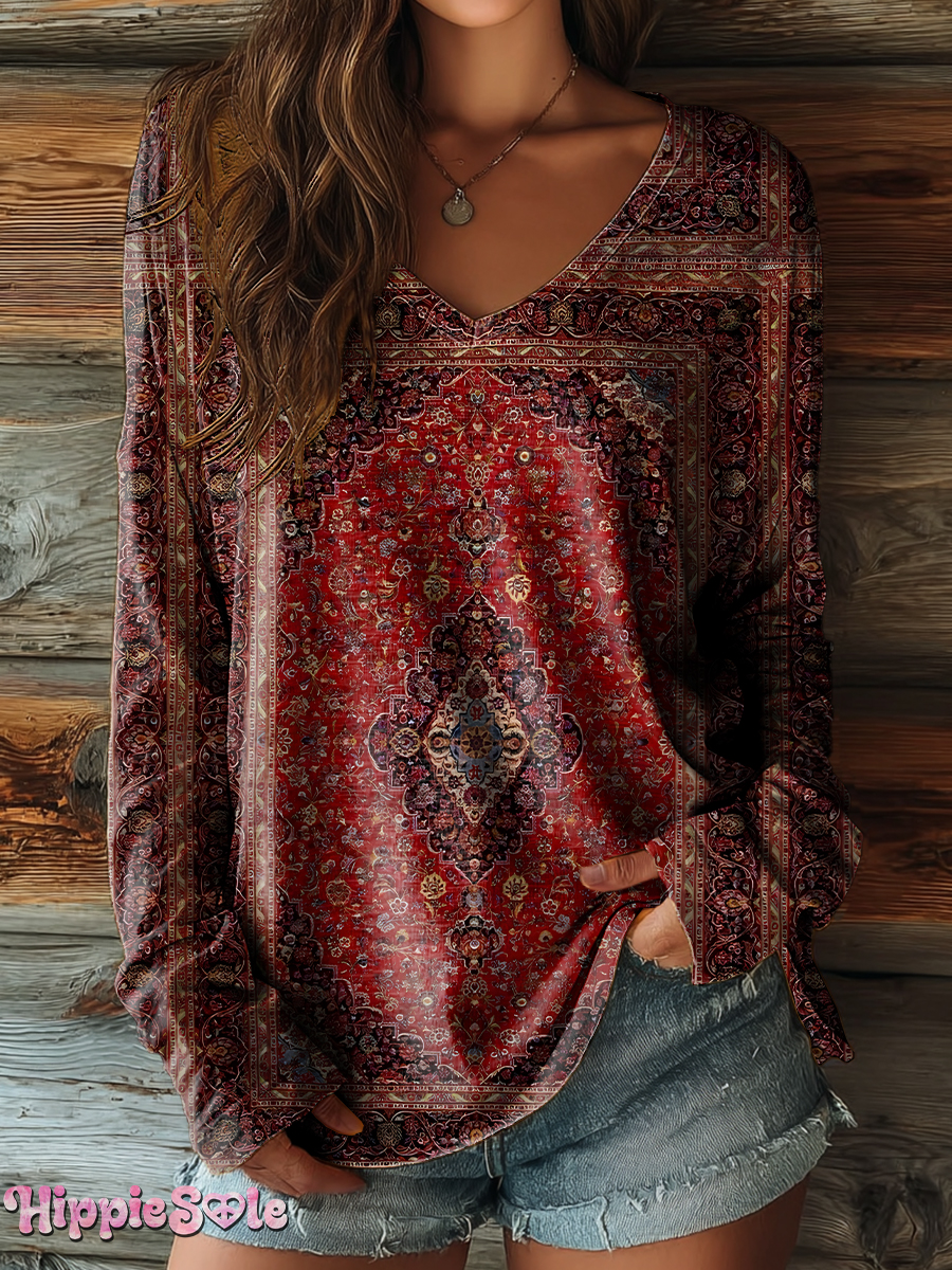 Women's Vintage Ethnic Floral Art Print Casual V-neck Long Sleeve T-shirt