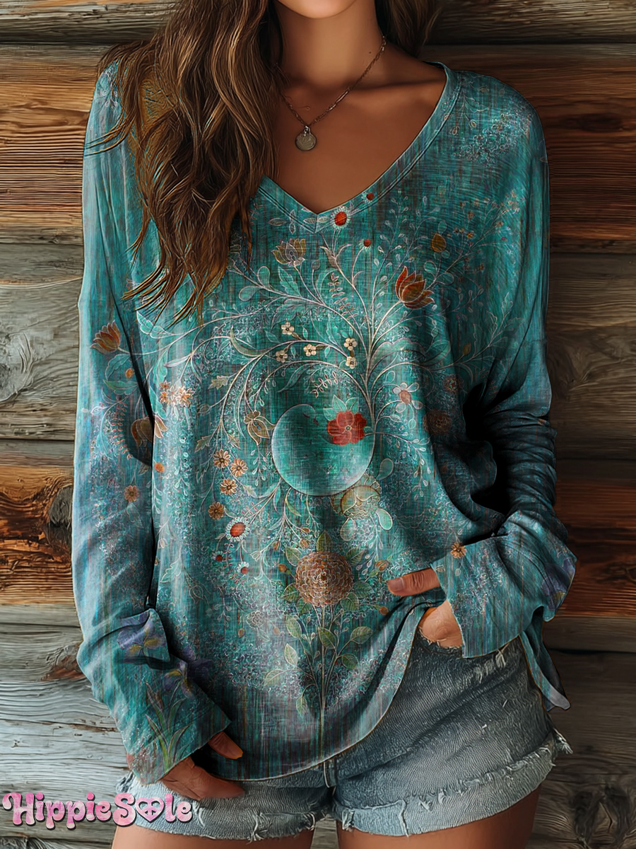 Women's Vintage Ethnic Floral Art Print Casual V-neck Long Sleeve T-shirt
