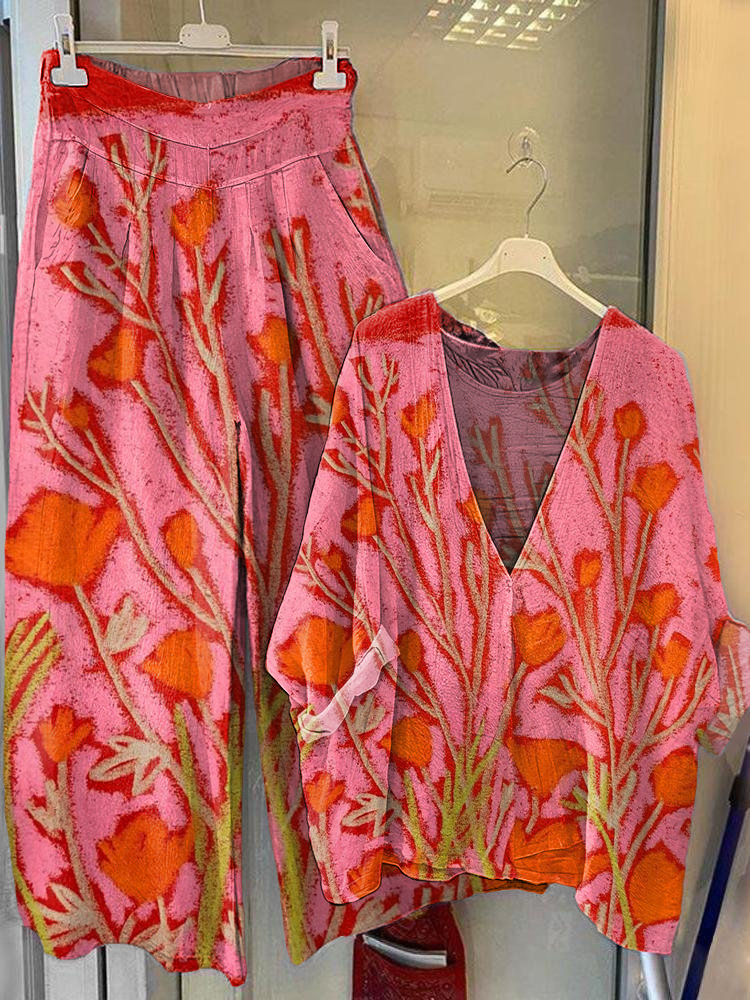 Women's Vintage Floral Art Printed V-Neck Top Wide-Leg Pants Cotton Linen Suit