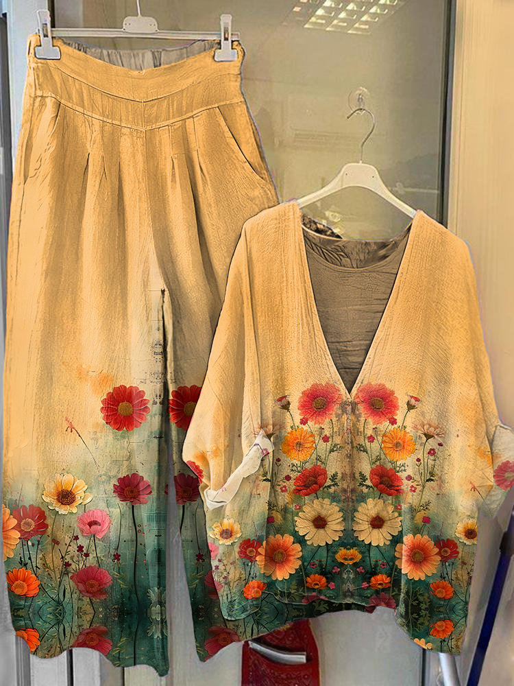 Women's Vintage Floral Art Printed V-Neck Top Wide-Leg Pants Cotton Linen Suit