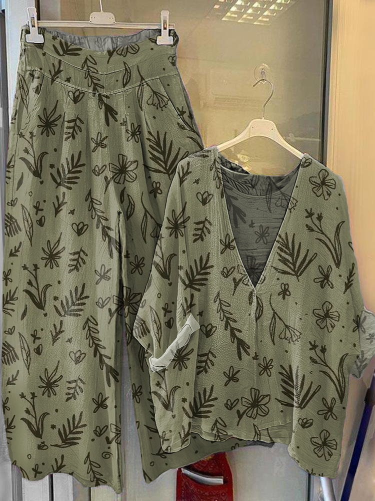 Women's Vintage Floral Art Printed V-Neck Top Wide-Leg Pants Cotton Linen Suit