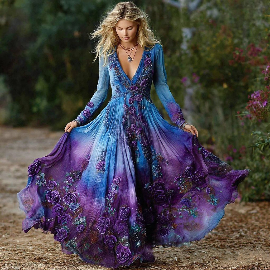 Women's Vintage Purple Rose Art Pattern Gradient Long Sleeve Dress