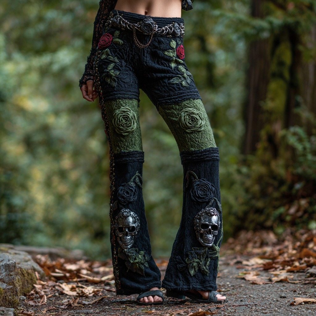 Women's Vintage Skull And Rose Pattern Casual Jeans