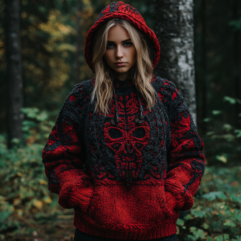 Women's Vintage Viking Tribal Celtic Skull Gradient Art Chunky Knit Hooded Sweater