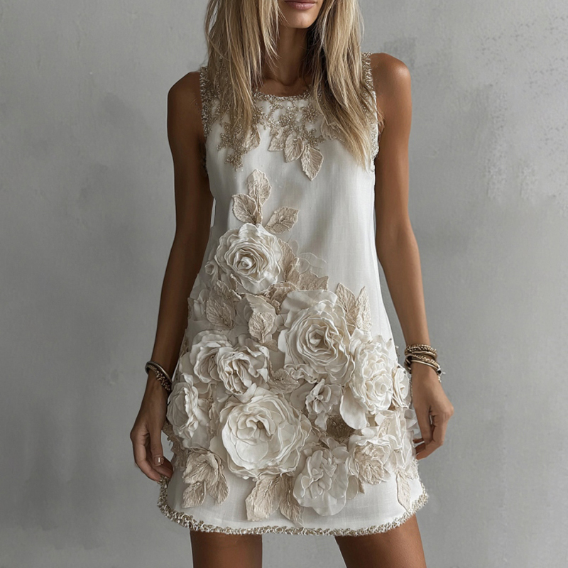 Women's White Rose Embroidered Art Round Neck Sleeveless Mini Dress